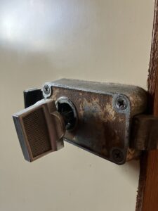 早速お伺いして見てみると川口技研のハイスWC表示錠が付いており内側のツマミも今にも取れそうな状態になっていて、年数的にも経年劣化で錠前自体がサビサビな状態でした。