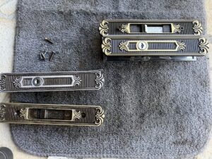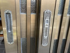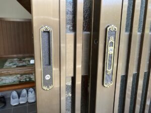 二枚引戸の真ん中に錠前が付いていて戸先にも鍵が付いているタイプで両方ともセットで交換しました、扉も少し傾いていたので滑車の高さも調整してスムーズに鍵が掛けれるようになりお客様にも喜んでいただけました